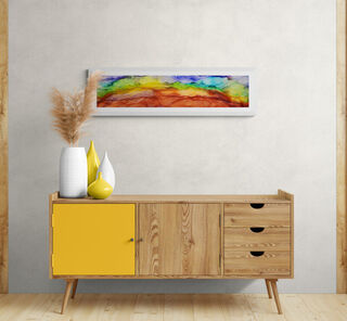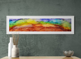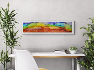Introducing a one-of-a-kind alcohol ink art painting that is sure to captivate and exuberate warmth in any room it is displayed in. Created using different air tools, this original art piece features vibrant and warm colours that flow and blend together in a beautiful abstract landscape panorama. Don't miss out on the opportunity to own this beautiful and one-of-a-kind alcohol ink art painting, that add a touch of warmth and beauty to your home or office.