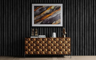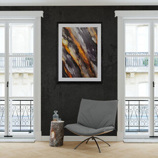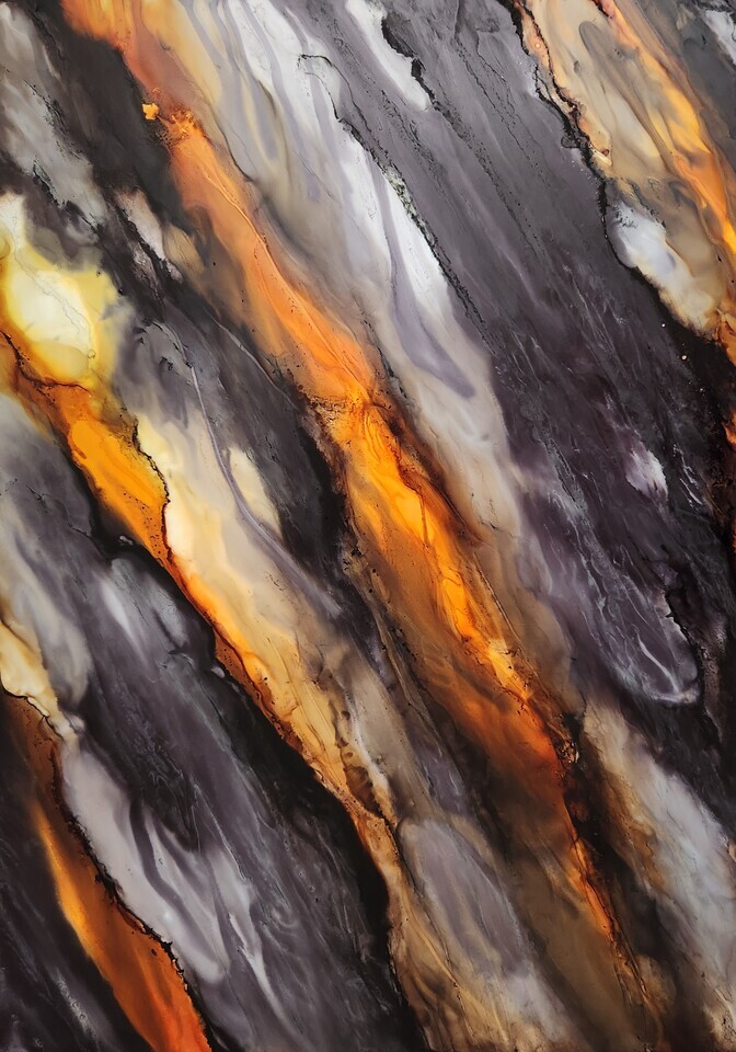 Dormant with Vigour captures the electric tension that lives beneath the earth’s surface — the quiet before eruption, the hidden pulse within stillness. Deep charcoal and ash-like tones create a sense of cooled volcanic rock, while fiery streaks of orange and gold cut through the surface with raw intensity.